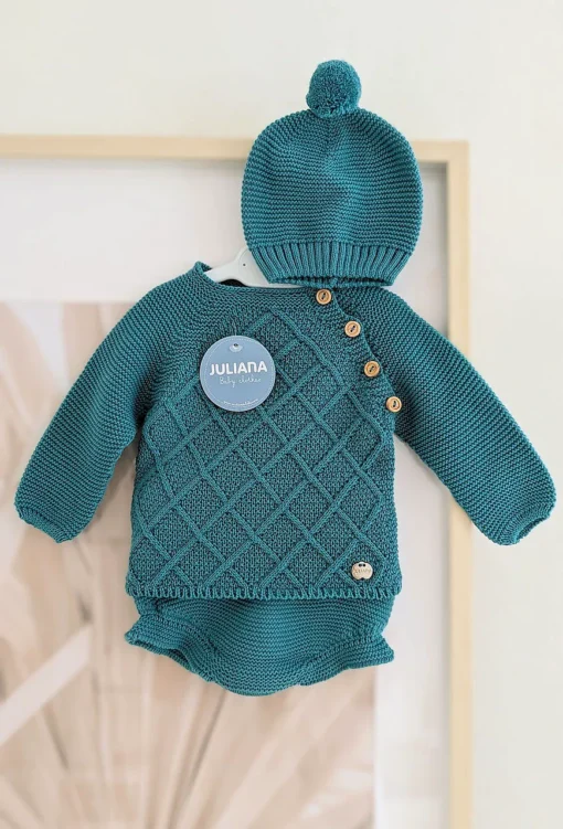 This cute fine knit set for boys is perfect for chilly days. The set consists of a soft sweater with a pattern and a button placket as well as matching shorts, and a small hat with a pompom rounds off the whole outfit. The high-quality knitted fabric not only offers coziness, but also a modern look.