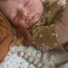 Sweet little one. Genesis heat set paint was used many layers to achieve a young baby few days old sized preemie baby .Sweet to hold and comforting ❤️I rooted with premium lightest brown soft mohair and lashes are rooted in same lightest brown color