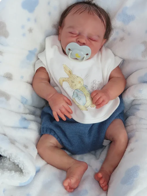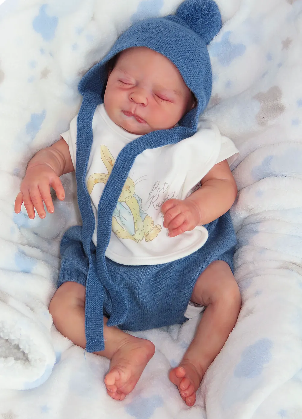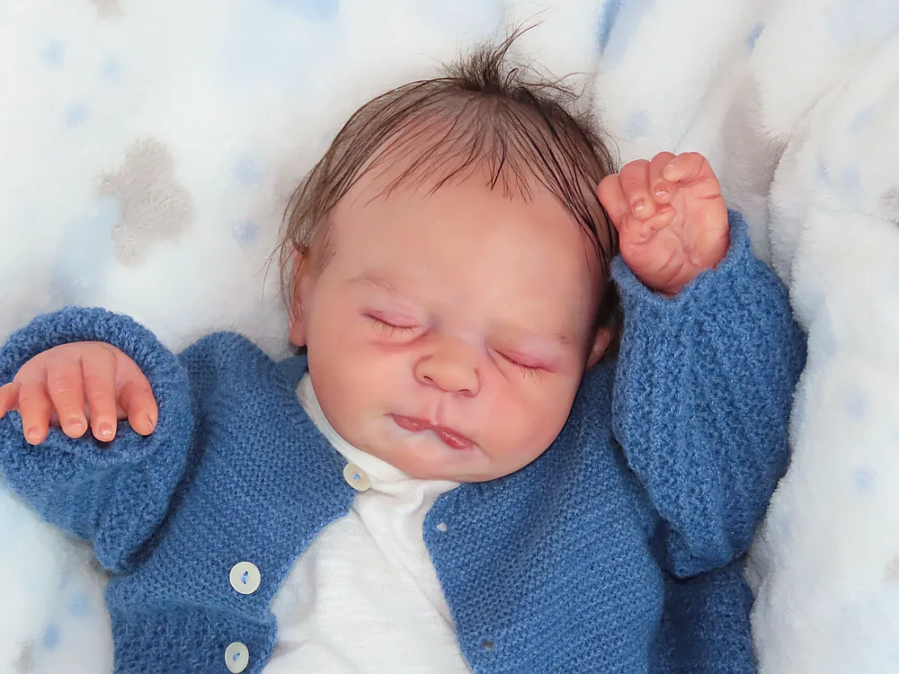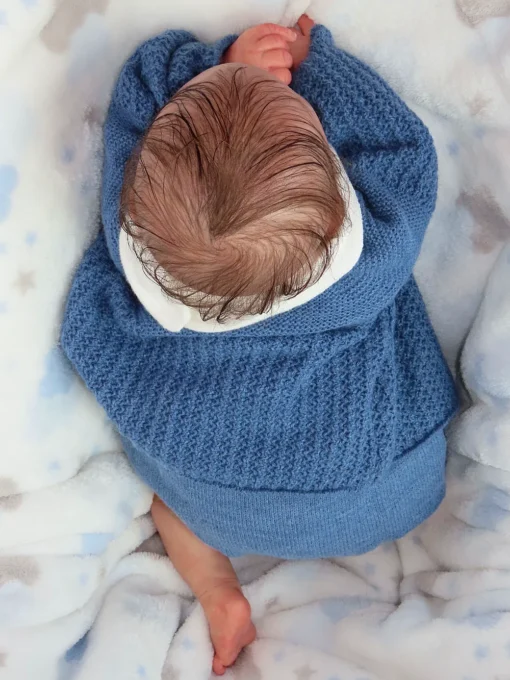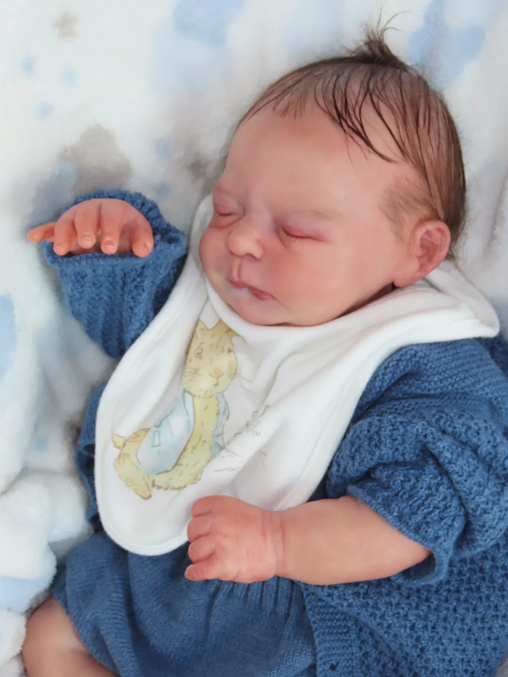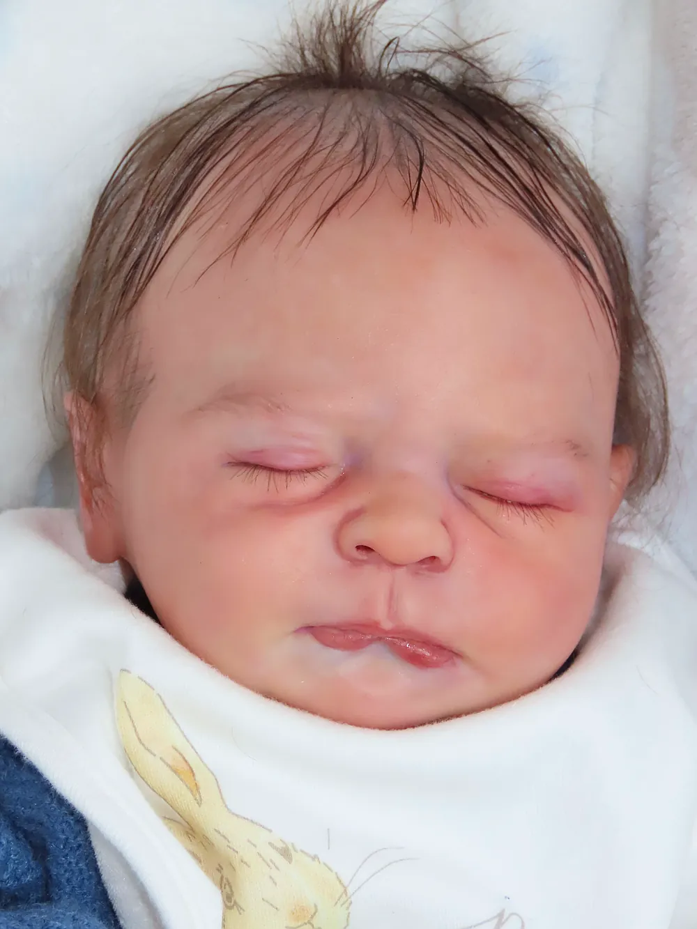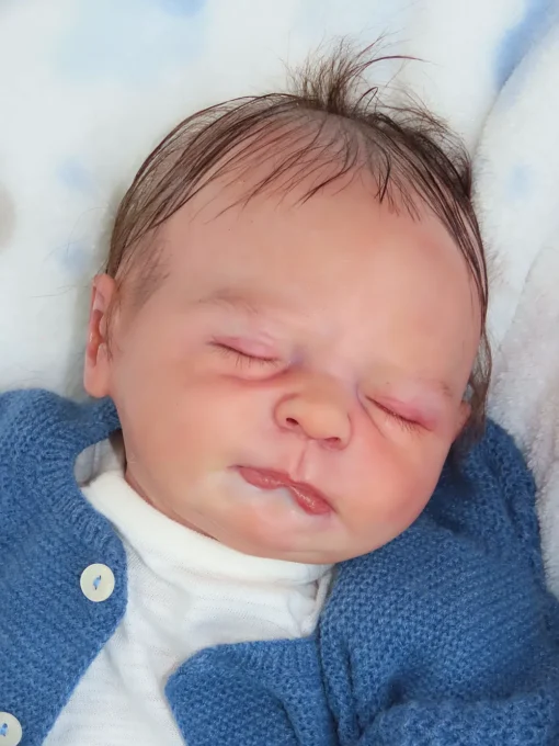 This beautiful boy is a limited edition sculpted and painted by Harley Rose & Bobby Wills and has veining, textured skin and is weighted to feel real. His hair is rooted on top of painted hair with Sarah silk in medium brown mohair.