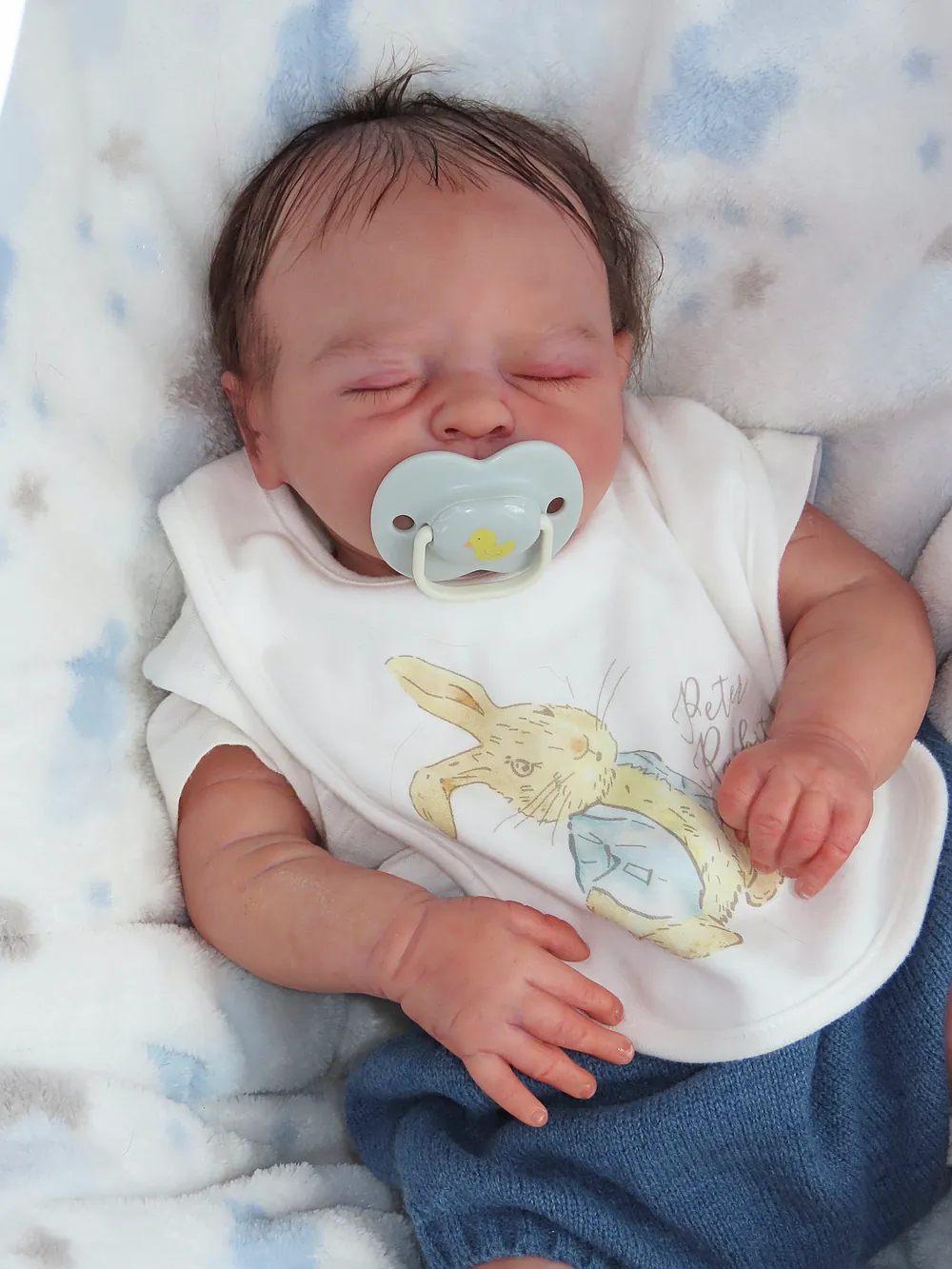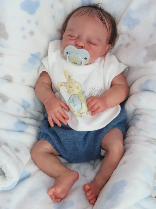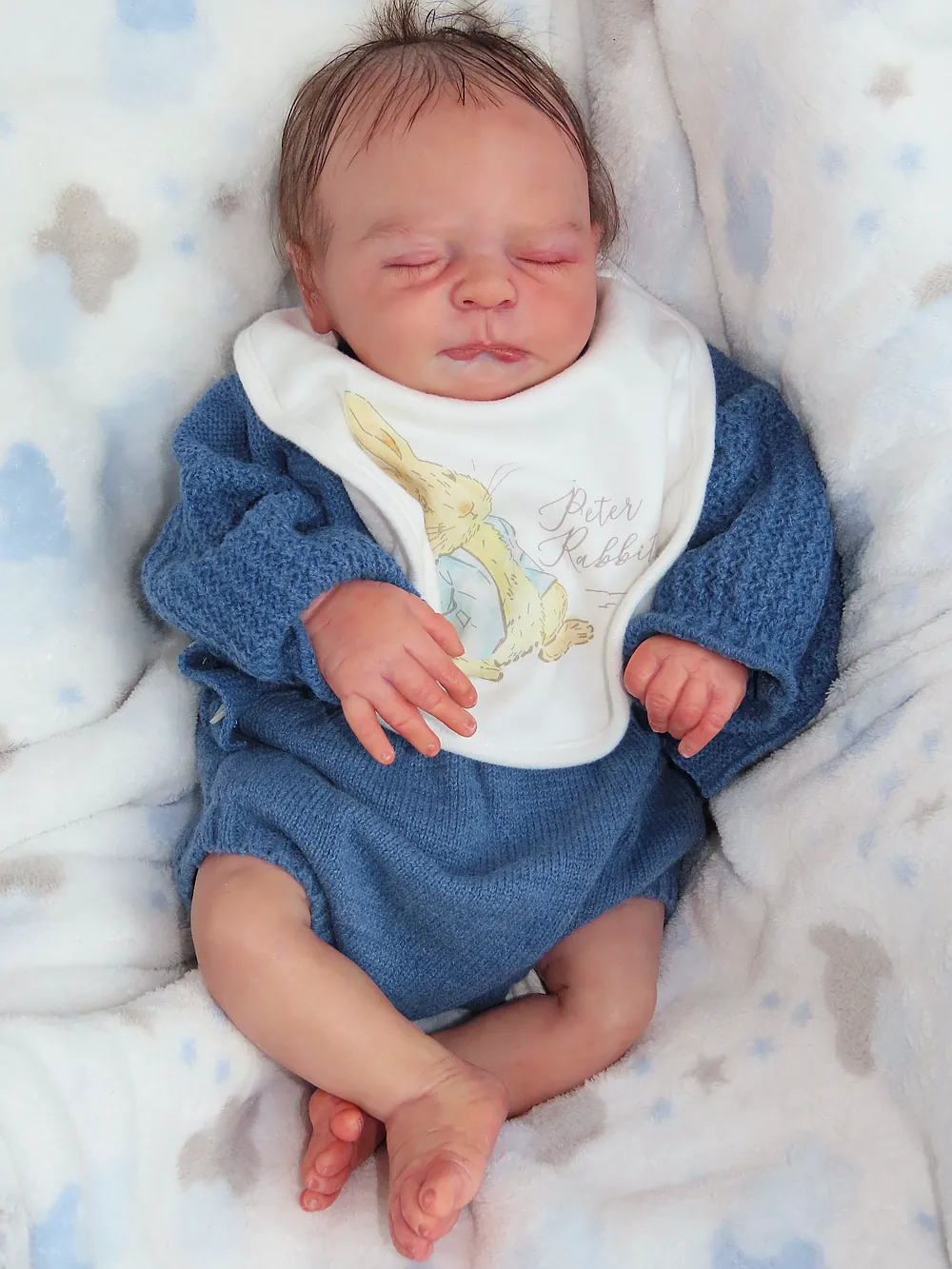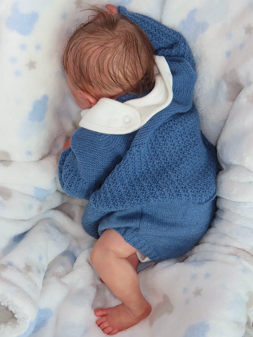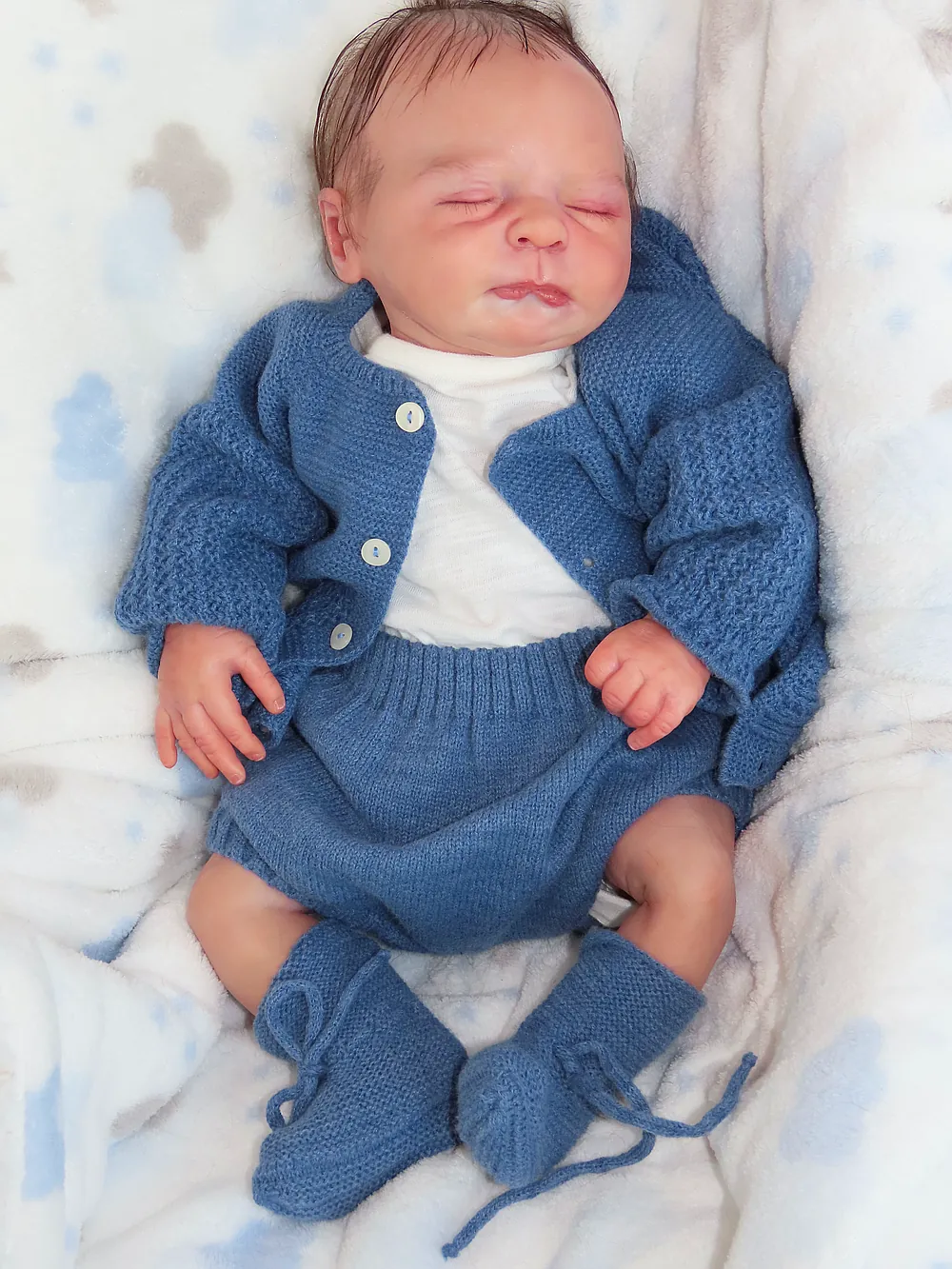 This beautiful boy is a limited edition sculpted and painted by Harley Rose & Bobby Wills and has veining, textured skin and is weighted to feel real. His hair is rooted on top of painted hair with Sarah silk in medium brown mohair.