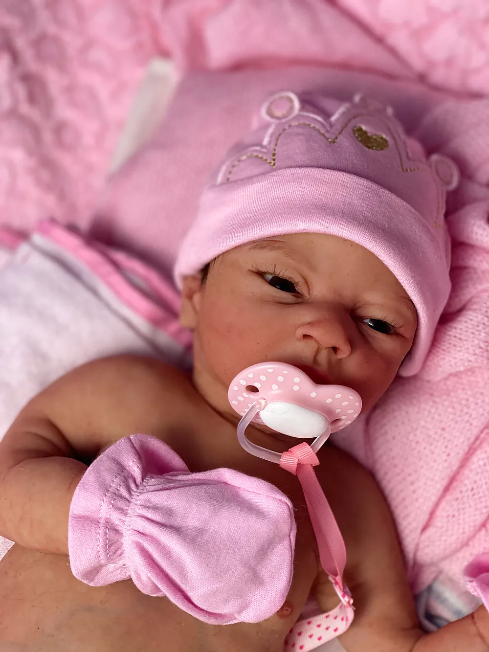 Her mouth is open with tongue, she can take regular small pacifiers.