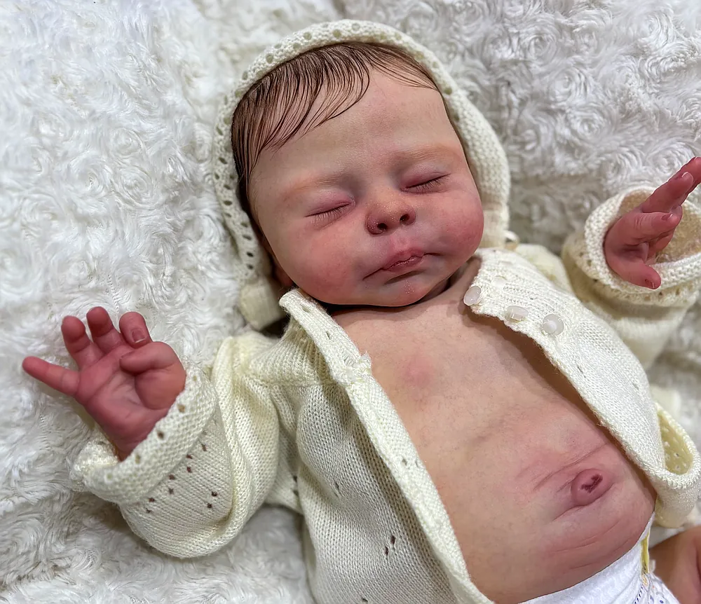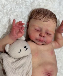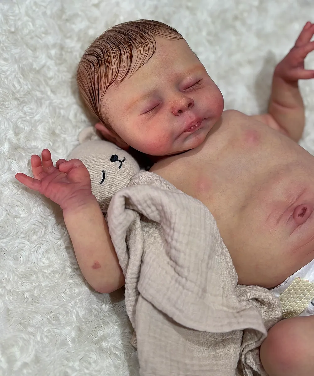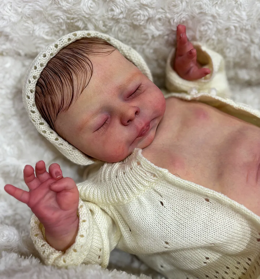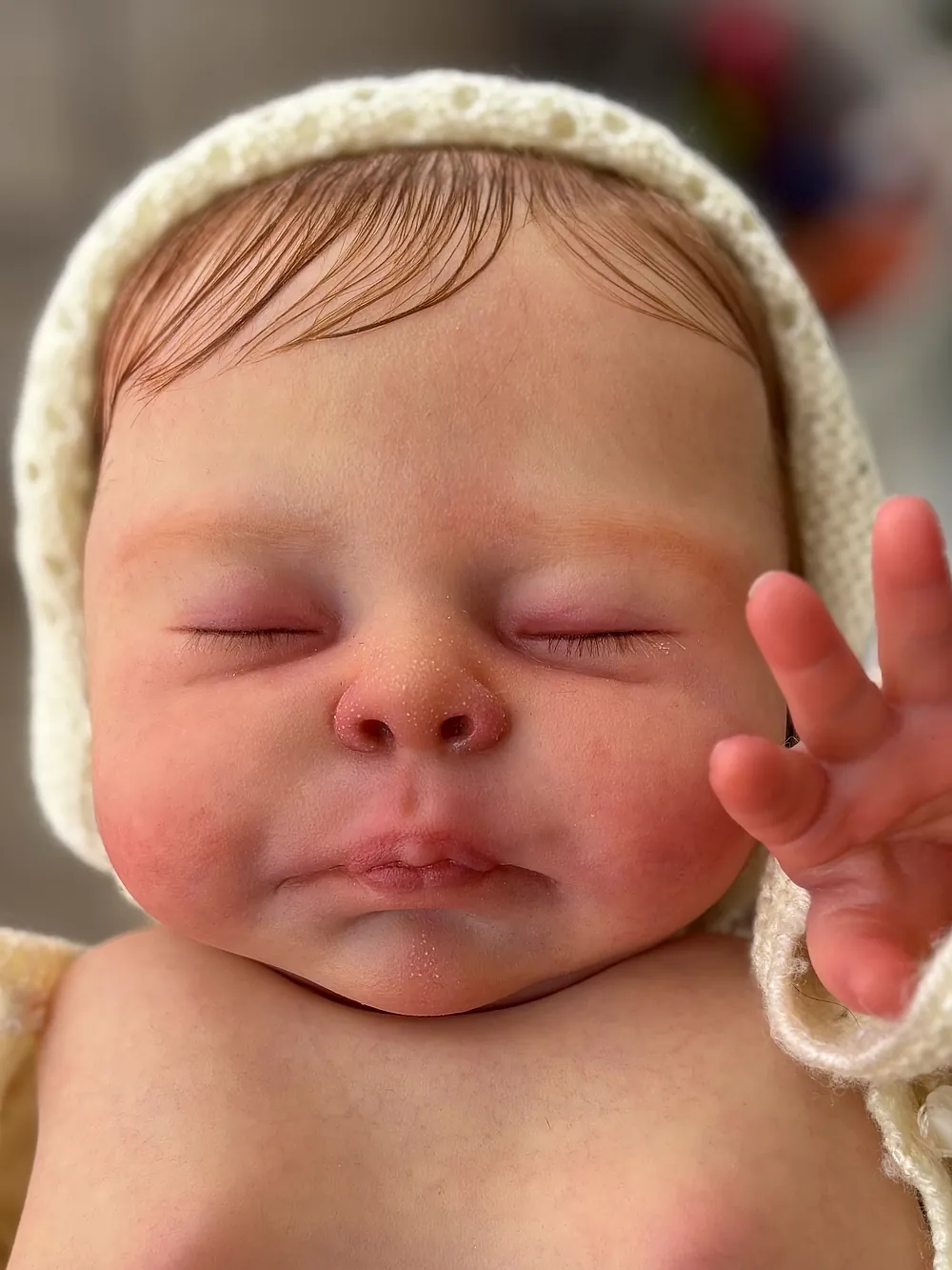 He has brown premium mohair mono and micro-rooted in a natural hair growth direction and matching rooted eyelashes.