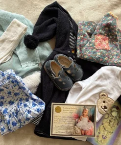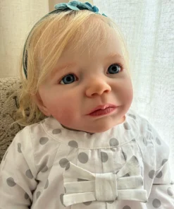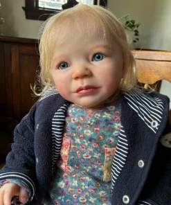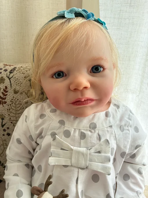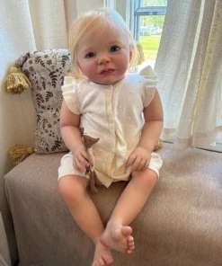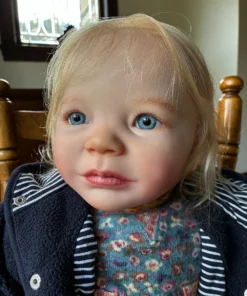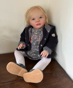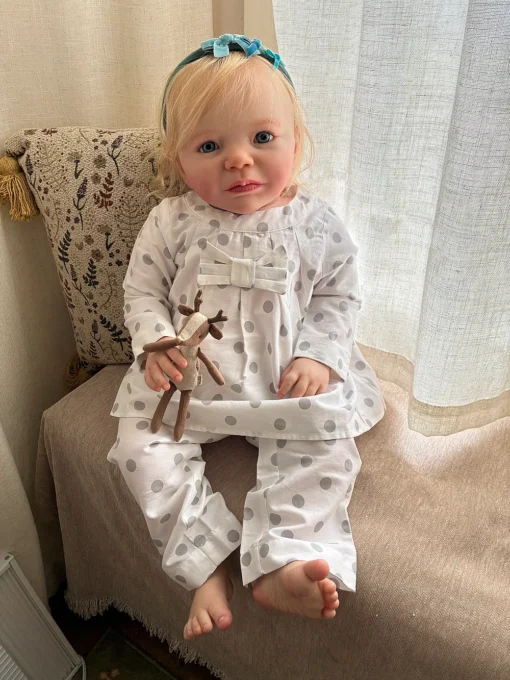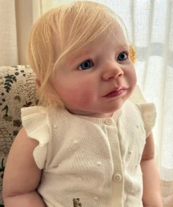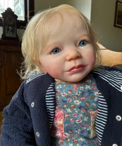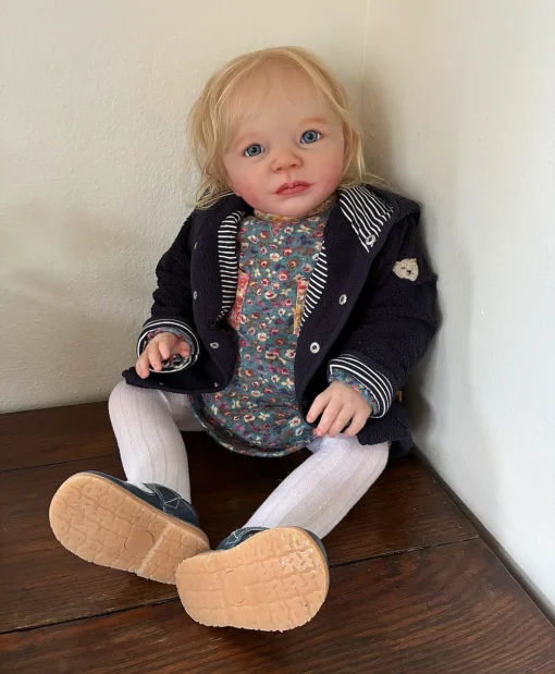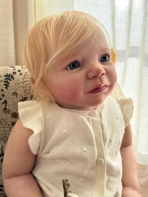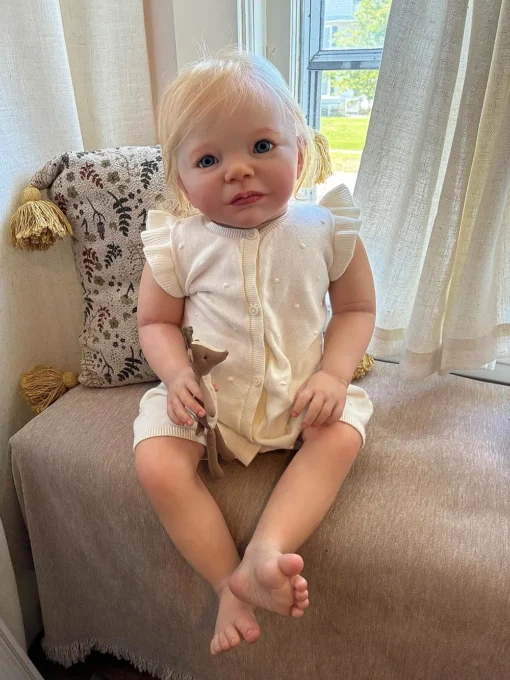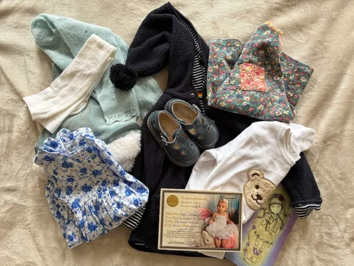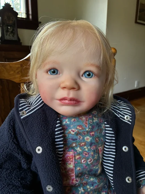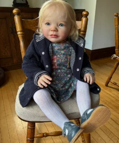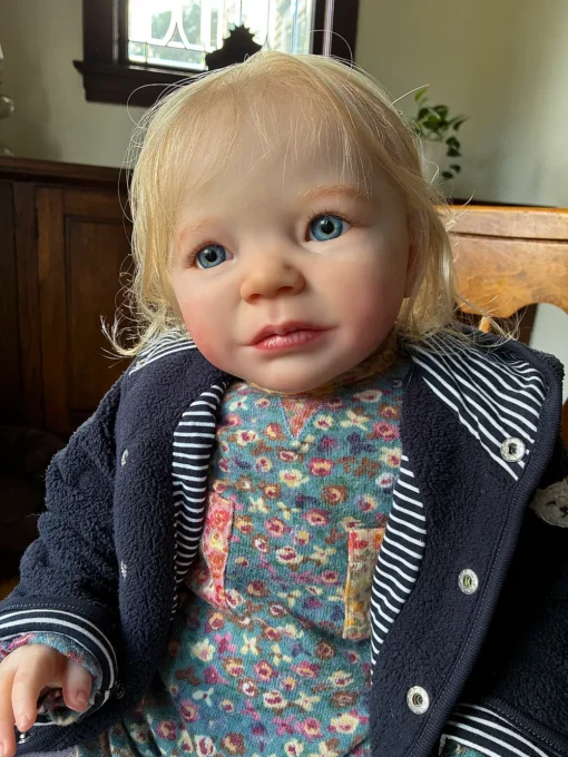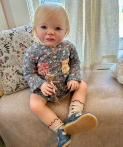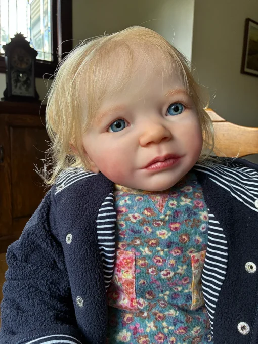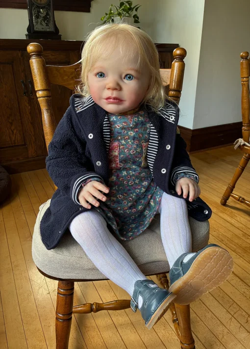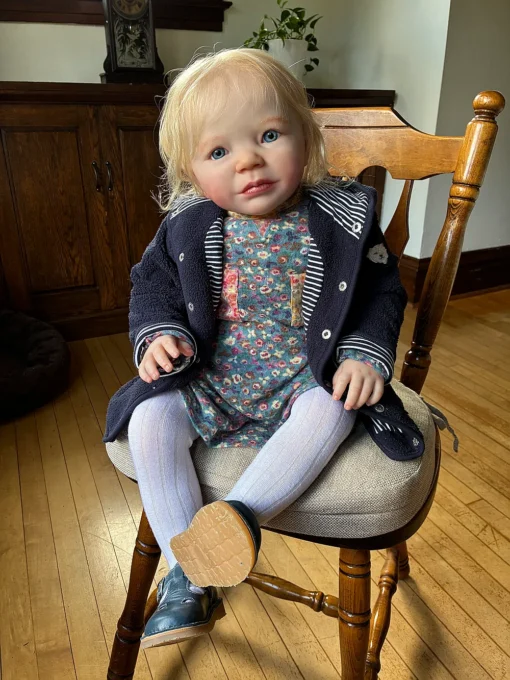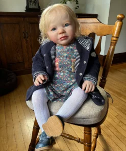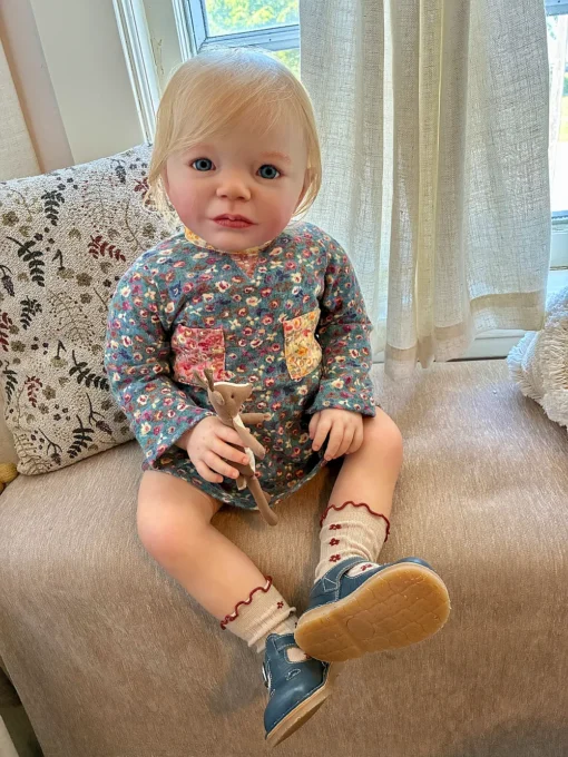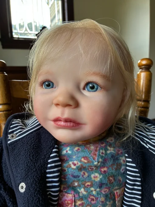 Emmy is unlike any other toddler I’ve owned & Marie’s artistry is impeccable. She’s a substantial size/weight, very snuggly & fits well on your hip. Her head circumference is around 19″. She’s a Realborn sculpt, so it makes sense that she’s more lifelike in sizing. This sculpt is no longer in production. She wears 12-18 month clothing and size 2-3 shoe. She will arrive with the outfits pictured, as well as her COA (toy is NOT included).