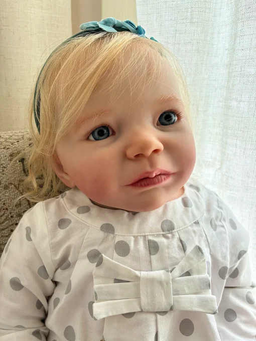 Sweet Emmy has soulful blue glass eyes, applied lashes and realistically rooted blond human hair. Her eyebrows are a mixture of painted/rooted and I adore her ruddy cheeks. She’s a very peaceful, calming baby.