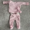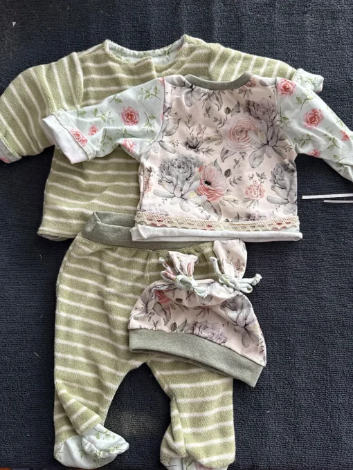 4 piece hand made set . Sage green and light pink flowers . Has jacket , top , bottoms , and hat . Can fit preemie and smalll newborn