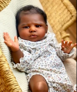 Painted Genesis Heat Set paint and finished with a matte varnish. Glossed in appropriate areas. Hair is rooted with soft black mohair. Subtle texture on face. Eyes are brown and made of glass.
