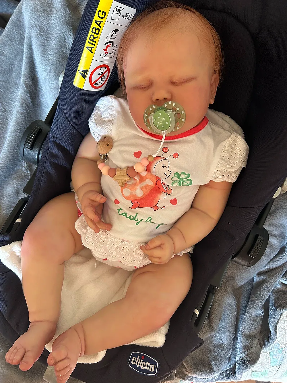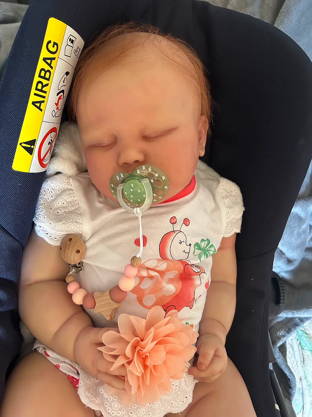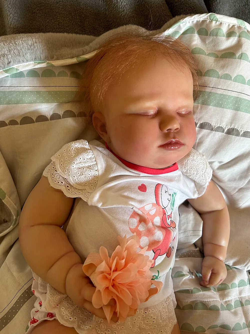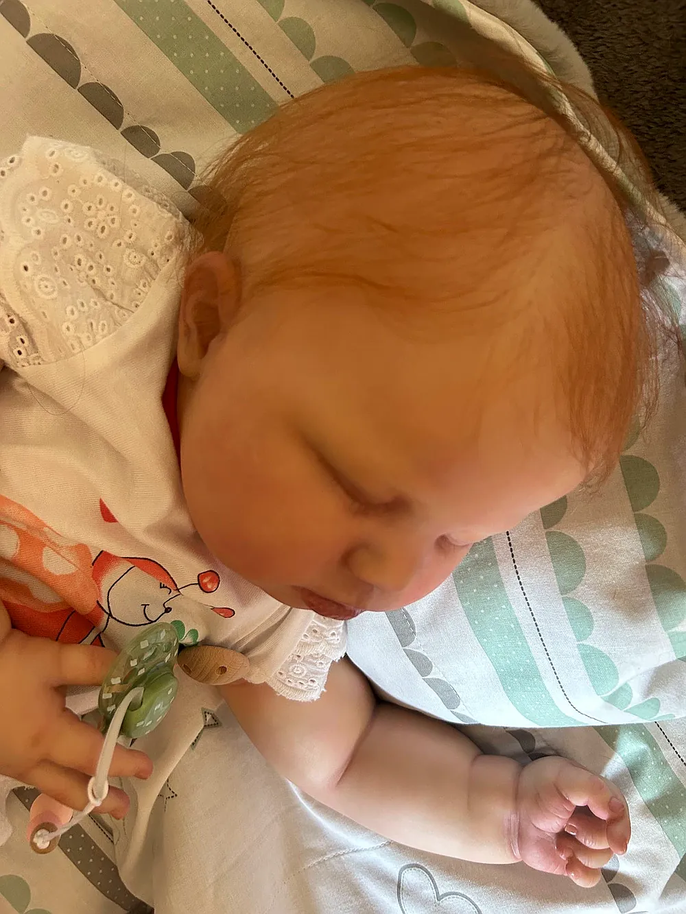 Handmade reborn doll 68cm tall June by Christine Scherer with COA. She has vinyl full legs, full arms and head and a soft cloth jointed body, she’s weighted with glass sand and stuffed with polyfil. She is heavy and floppy like a real sleeping baby. She has micro-rooted red hair and lashes. She can take a regular pacifier.