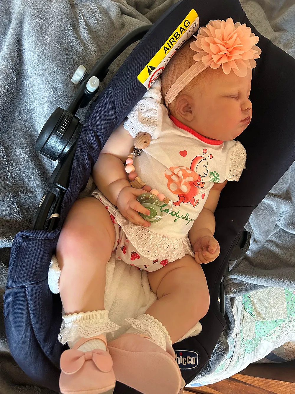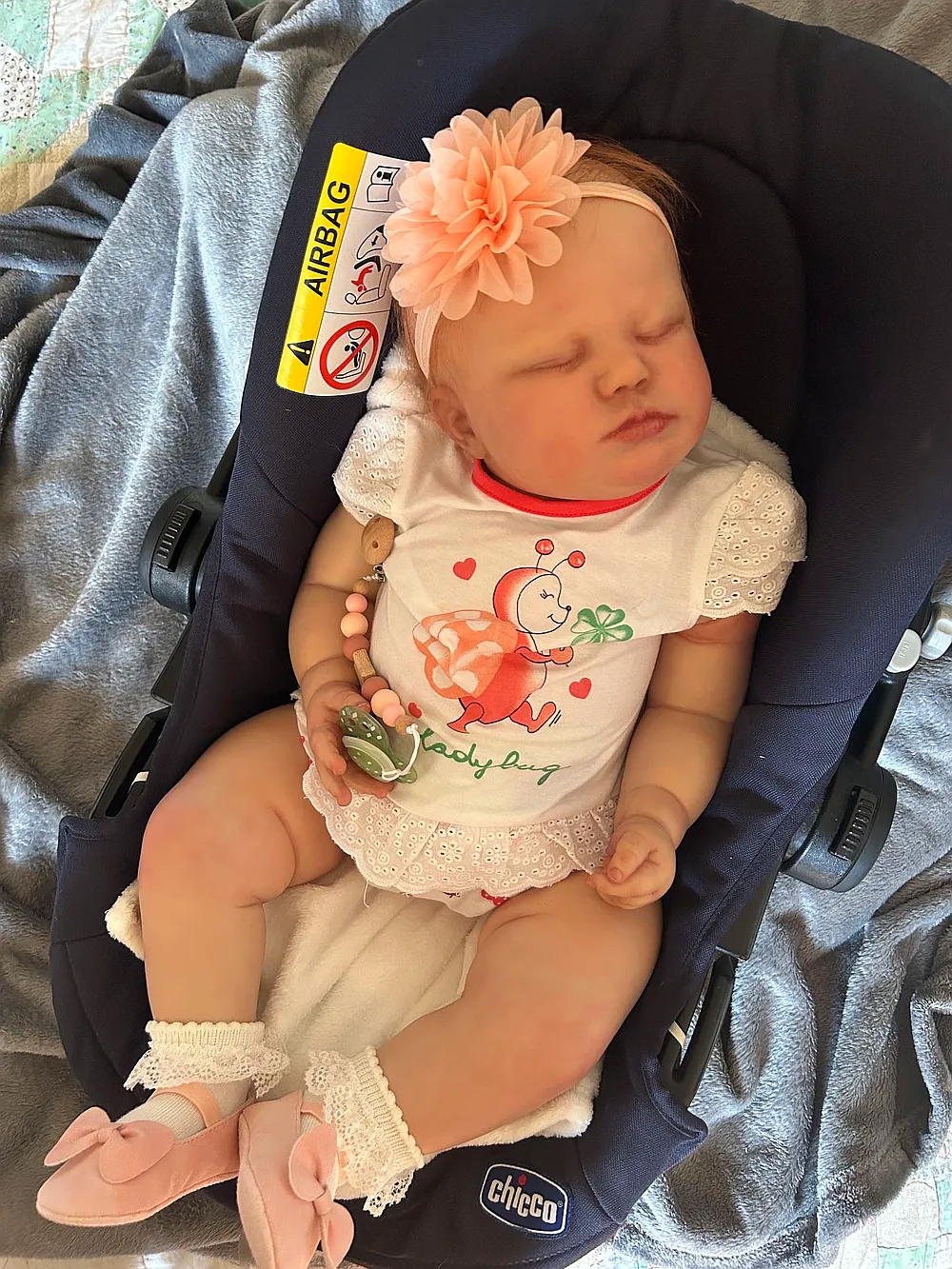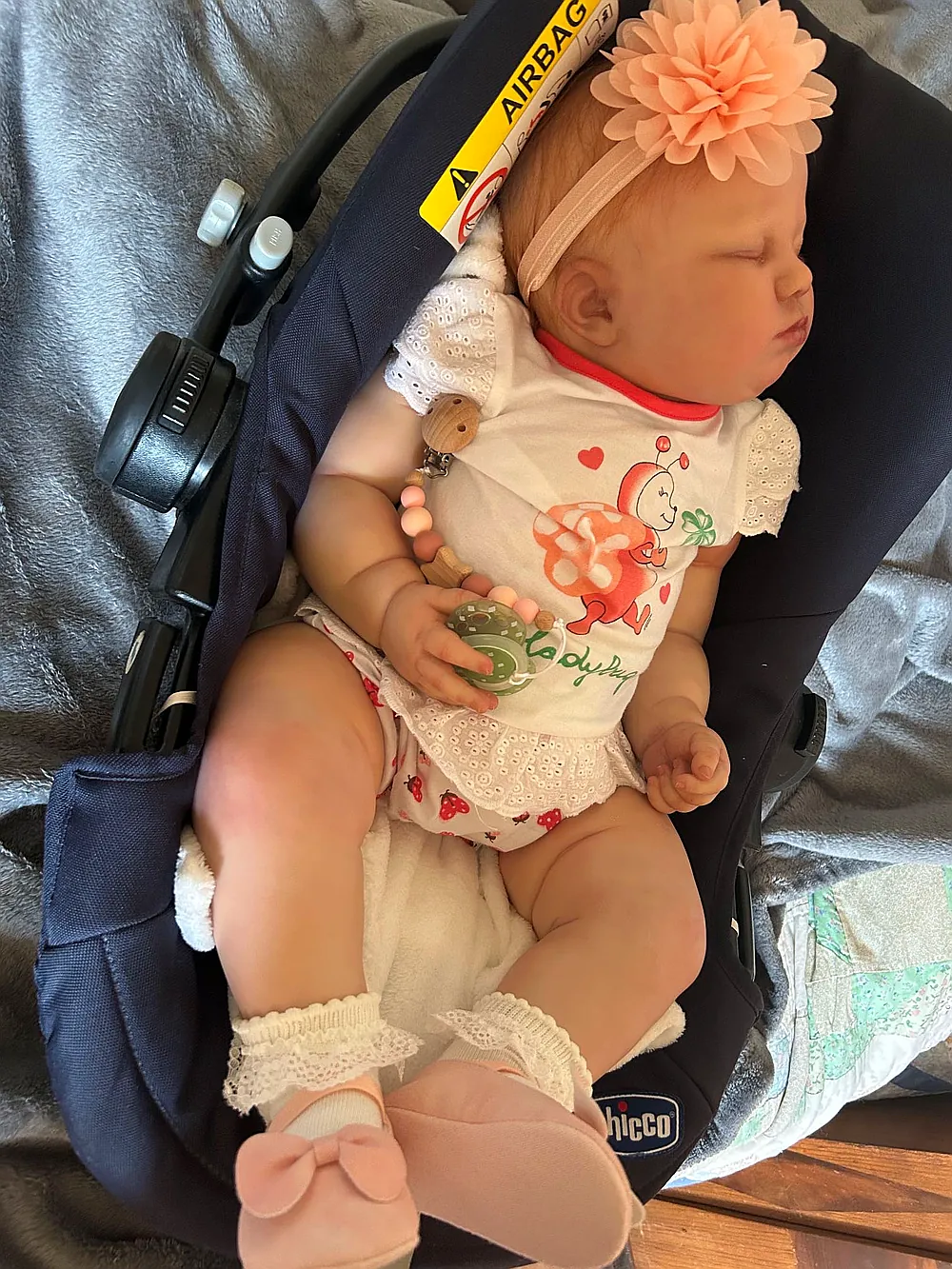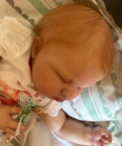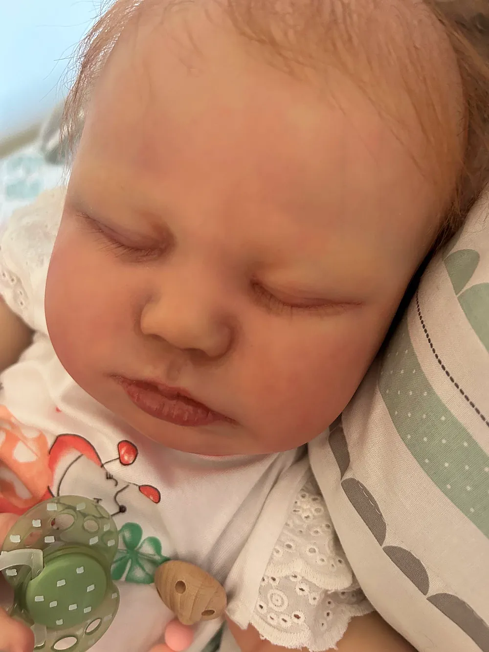 Handmade reborn doll 68cm tall June by Christine Scherer with COA. She has vinyl full legs, full arms and head and a soft cloth jointed body, she’s weighted with glass sand and stuffed with polyfil. She is heavy and floppy like a real sleeping baby. She has micro-rooted red hair and lashes. She can take a regular pacifier.