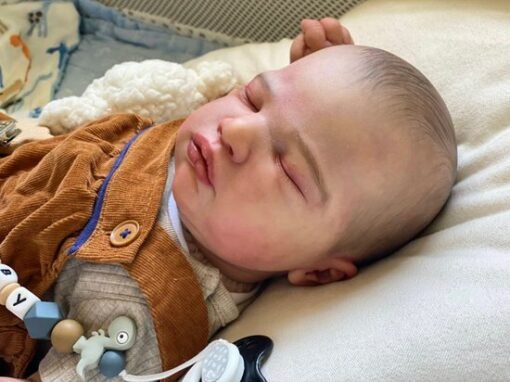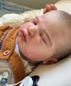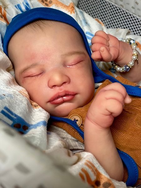 Painted with Genesis Heat Set paints. Finished with a matte varnish with an added soft coat. Junis has been weighted head to toe with fine glass beads. His body is stuffed with luxury polyfill, glass beads, and soft baby fat beads. Head is floppy and needs support.