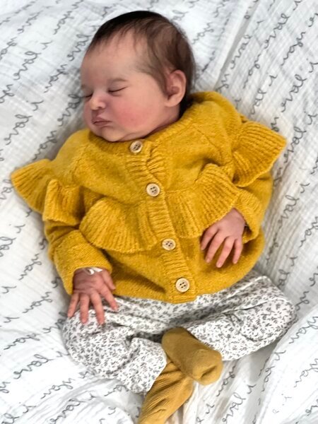 This Laura has beautiful coloring and beautiful hair! She has a baby powder scent. She is so cuddly!! She will come with her COA and all of her original outfits and blanket. Please note that the yellow sweater outfit shown is her original. She also comes with a couple other beautiful original outfits. This includes all of the originals shown in the last picture (not the clothing or props that may be shown in other pics).