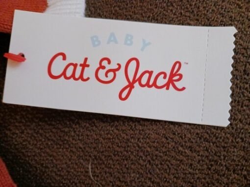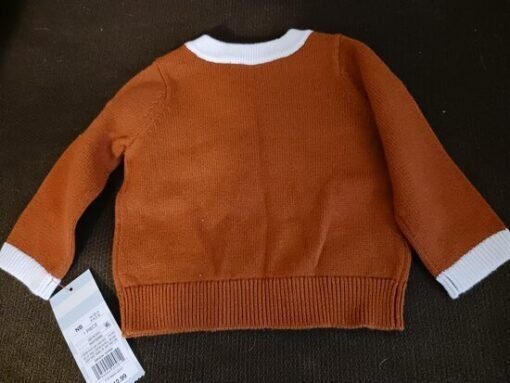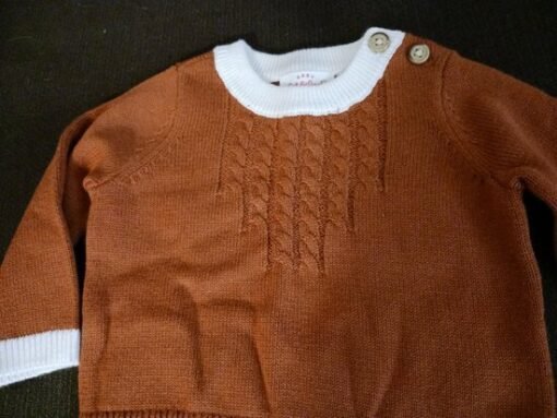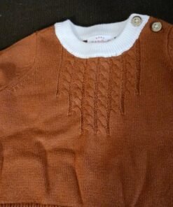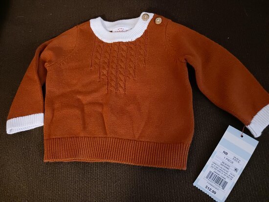This adorable little long sleeve knit pullover sweater is rust color with cream trim. There are 6 rows of cables running down the front, & 2 buttons at the left shoulder opening. It is so soft! Size NB by Cat & Jack. It is new with tags.