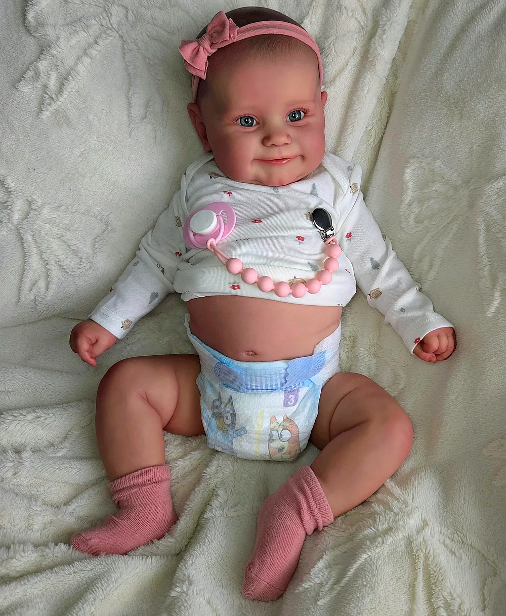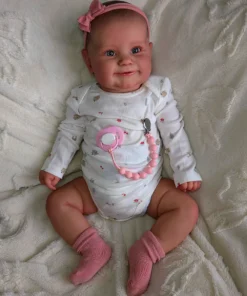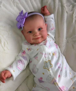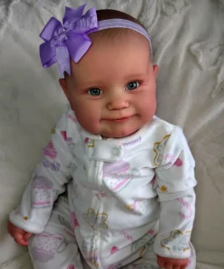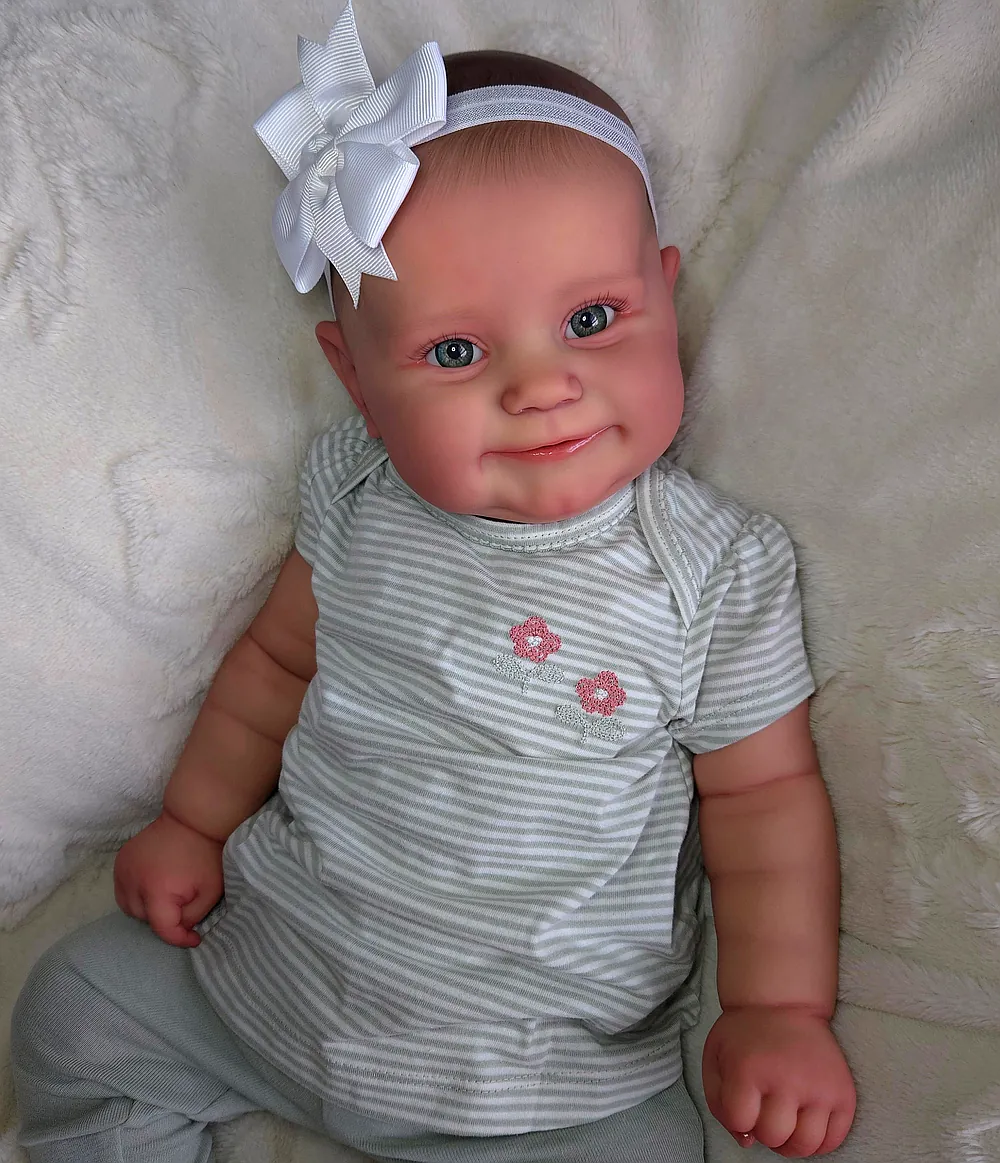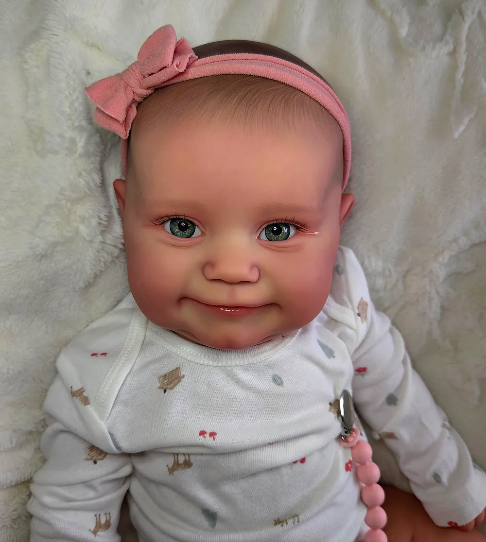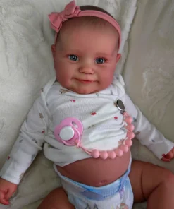 This listing is for Reborn baby girl Maddie. Maddie is 24″ long. I used genesis heat set paint to give her natural looking baby skin including mottling and veins. She is sealed with satin varnish.1 She has realistic, dark brown painted hair, a warm skin tone, applied lashes, green eyes and manicured nails. She comes with a belly plate that can be tied on over her cloth body. Her head body and limbs are weighted with glass bead media to give her a weight of approx 9 lbs. She has full limbs and fits in size 6 month clothing. She will arrive with…