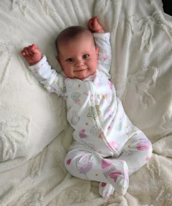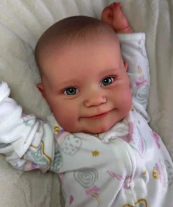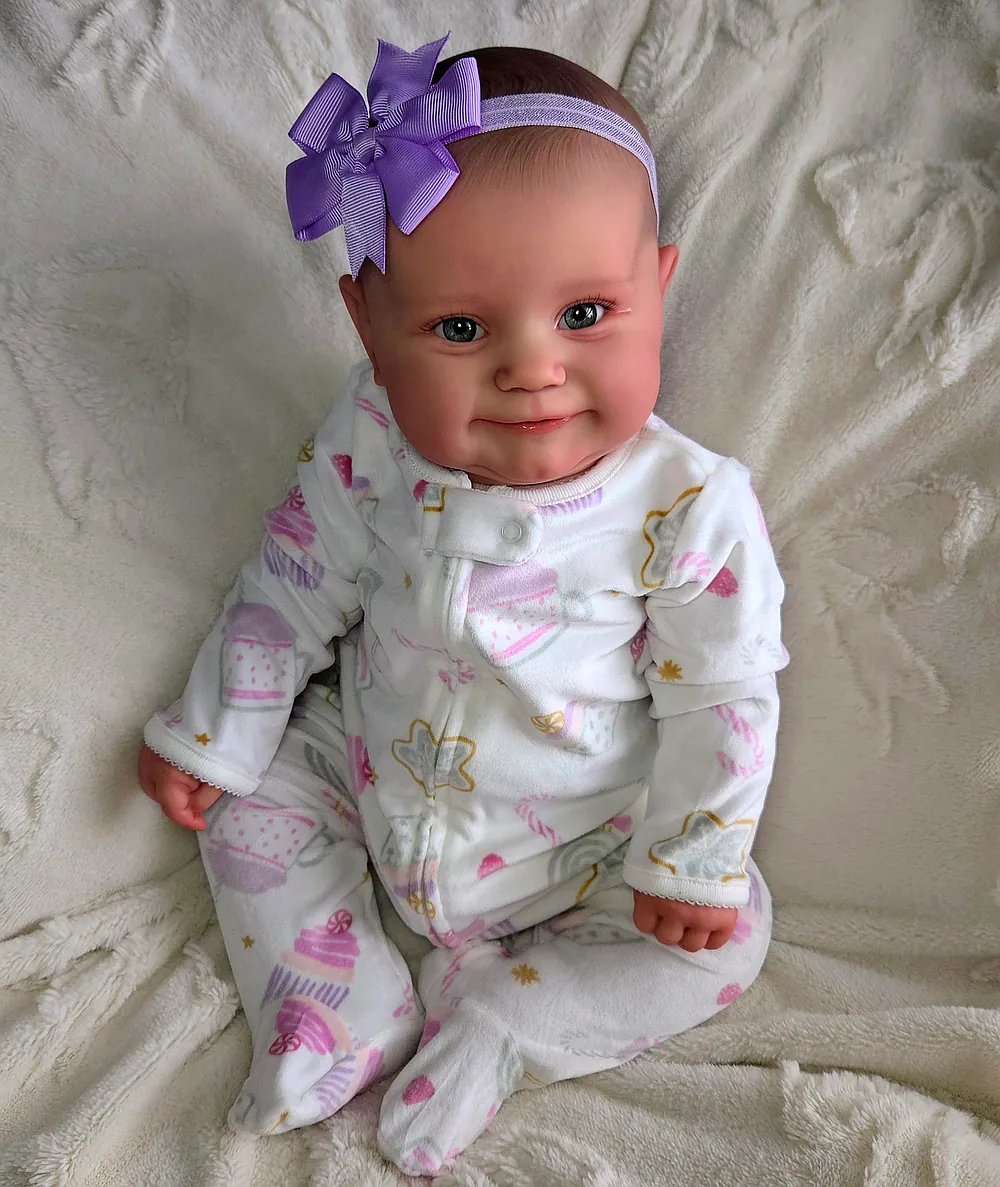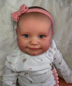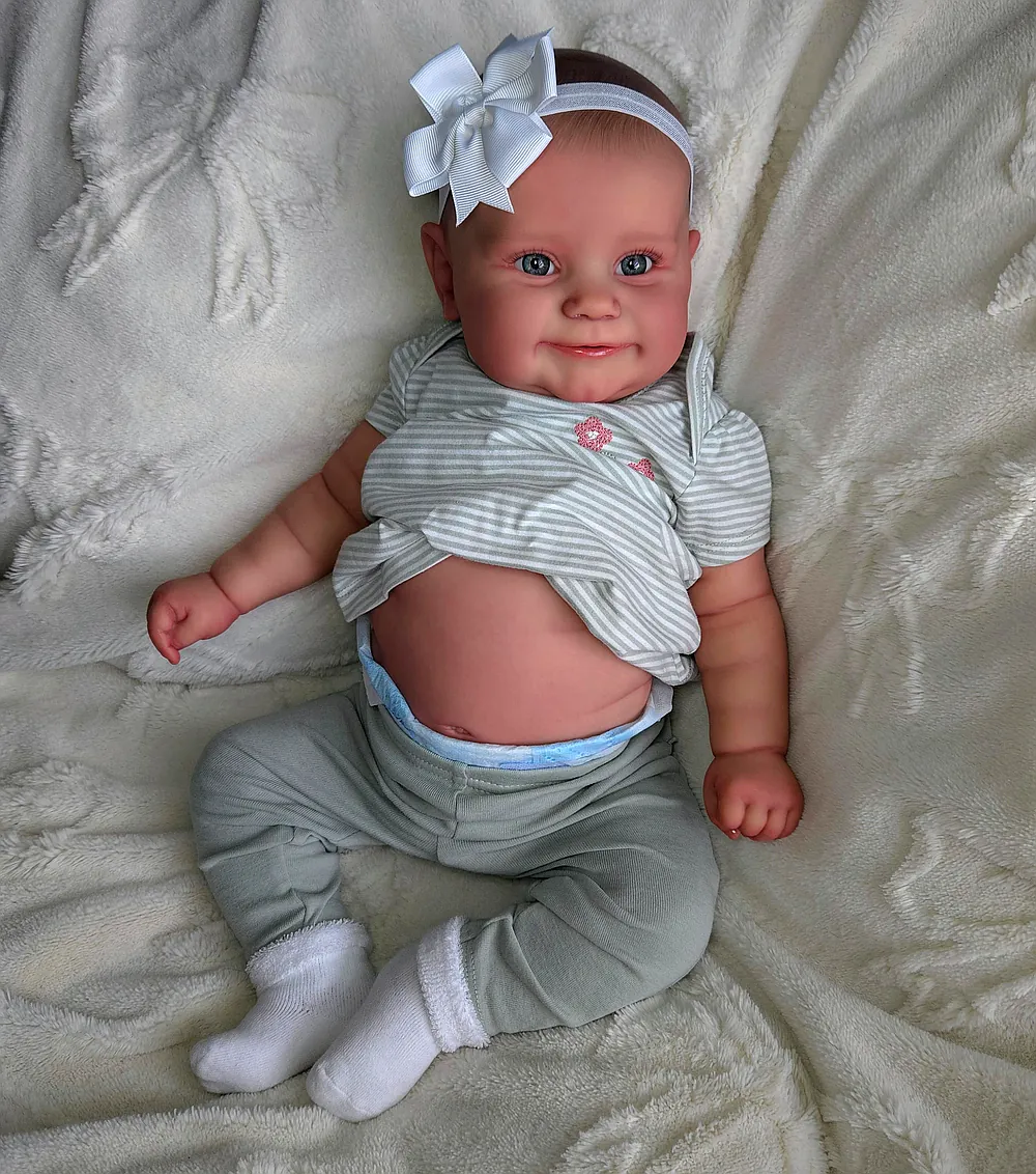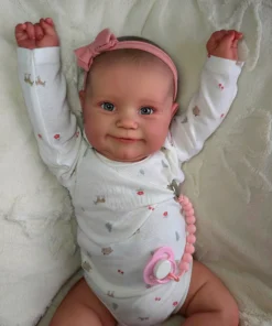 This listing is for Reborn baby girl Maddie. Maddie is 24″ long. I used genesis heat set paint to give her natural looking baby skin including mottling and veins. She is sealed with satin varnish.1 She has realistic, dark brown painted hair, a warm skin tone, applied lashes, green eyes and manicured nails. She comes with a belly plate that can be tied on over her cloth body. Her head body and limbs are weighted with glass bead media to give her a weight of approx 9 lbs. She has full limbs and fits in size 6 month clothing. She will arrive with…