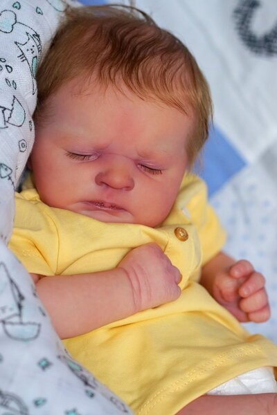 His body is realistically weighted and is about 4.34 lbs (1970 gramms), head, body and limbs are weighted by quality ultra fine and fine glass beads and fine fiberfill.