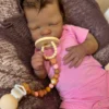 He is made with Eco flex 20 soft blend silicone has armatures in the arms and legs, beautiful brown eyes, gorgeous, rooted hair and is phenomenal to hold. He can take a modified pacifier and he is anatomically correct and just melt your heart. It comes with his certificate, a few outfits and blanket.
