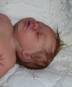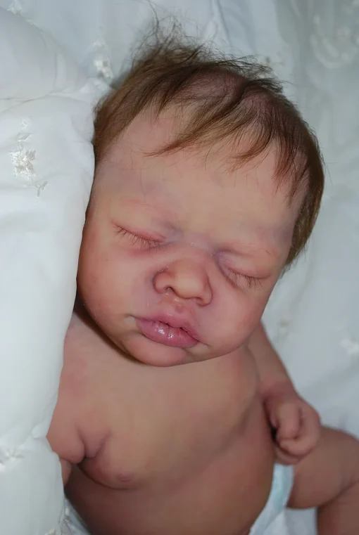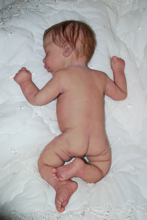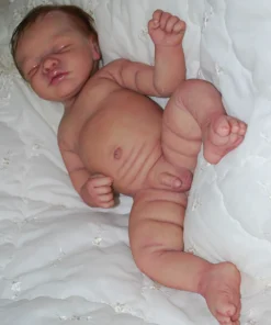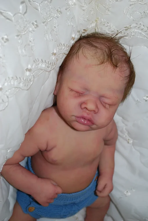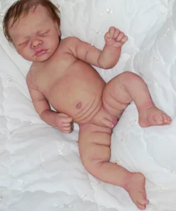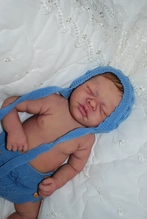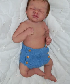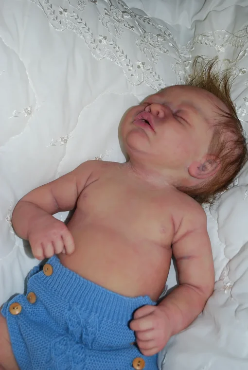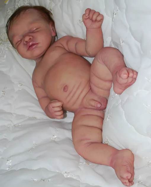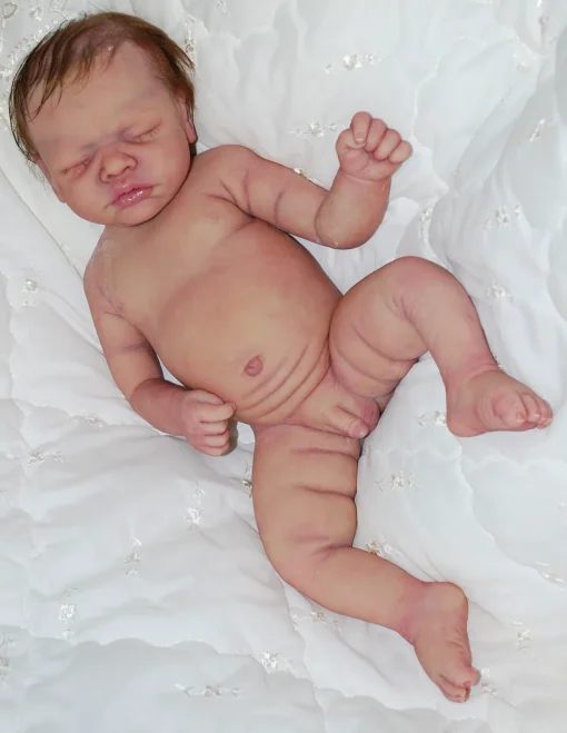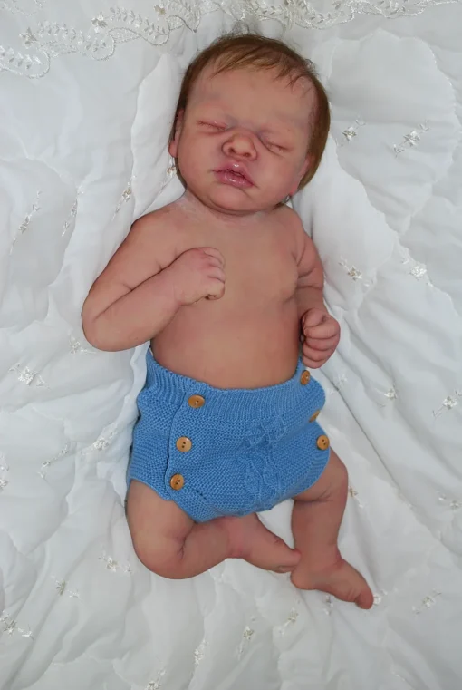 Meet Neeley, a stunning full-body silicone baby doll that looks lifelike. He measures 19 inches long and weighing 7 lbs. 12 oz, he has the perfect size and weight of a real newborn. Crafted from soft Eco-20 Slacker silicone, Neeley features an armature in his arms for posing and movement. His hair and eyelashes are hand-rooted with premium brown Mohair for a truly natural look. Neeley’s skin is hand-painted with attention to detail, including capillaries on his cheeks and eyelids for a realistic touch. His skin is subtly modeled, adding to his authentic baby-like appearance, and the artistry in his painting ensures that no two Neeley’s are alike. Minor imperfections are a natural part of his hand-crafted process, making him even more special and unique. Neeley comes with the outfit in photos, a COA and a small box opening to make his arrival more meaningful.