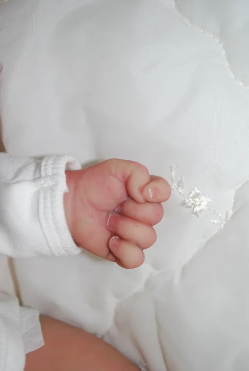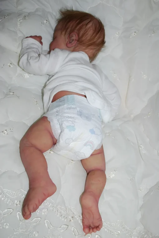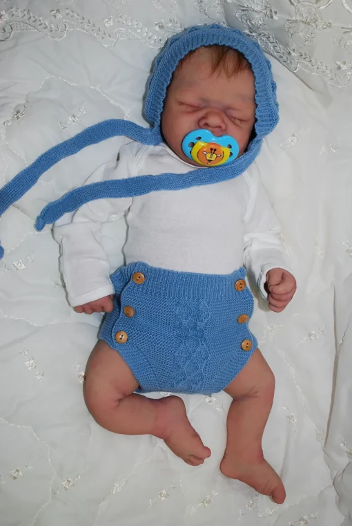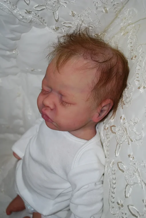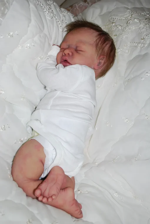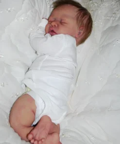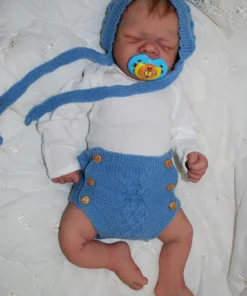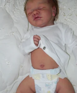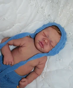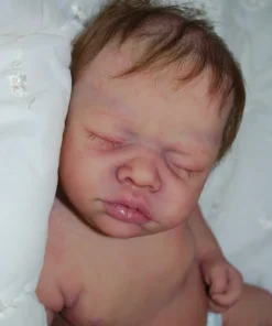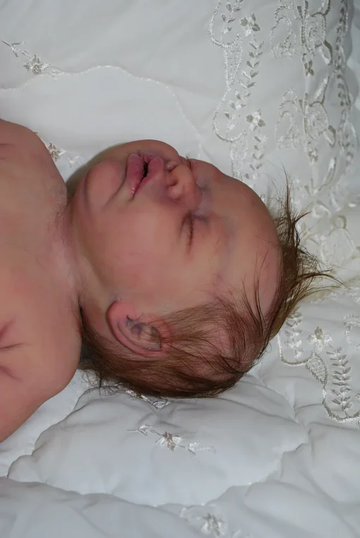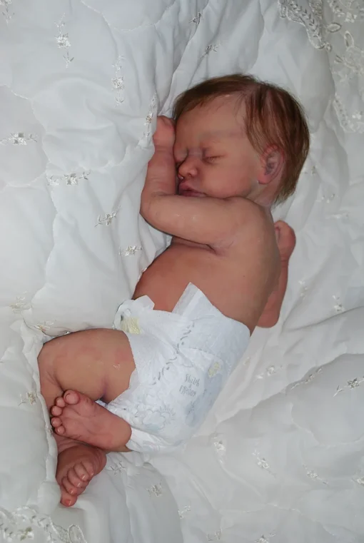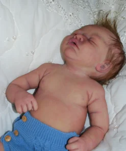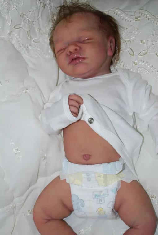 Meet Neeley, a stunning full-body silicone baby doll that looks lifelike. He measures 19 inches long and weighing 7 lbs. 12 oz, he has the perfect size and weight of a real newborn. Crafted from soft Eco-20 Slacker silicone, Neeley features an armature in his arms for posing and movement. His hair and eyelashes are hand-rooted with premium brown Mohair for a truly natural look. Neeley’s skin is hand-painted with attention to detail, including capillaries on his cheeks and eyelids for a realistic touch. His skin is subtly modeled, adding to his authentic baby-like appearance, and the artistry in his painting ensures that no two Neeley’s are alike. Minor imperfections are a natural part of his hand-crafted process, making him even more special and unique. Neeley comes with the outfit in photos, a COA and a small box opening to make his arrival more meaningful.