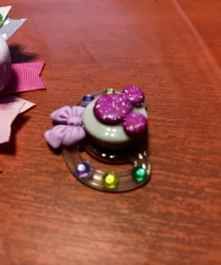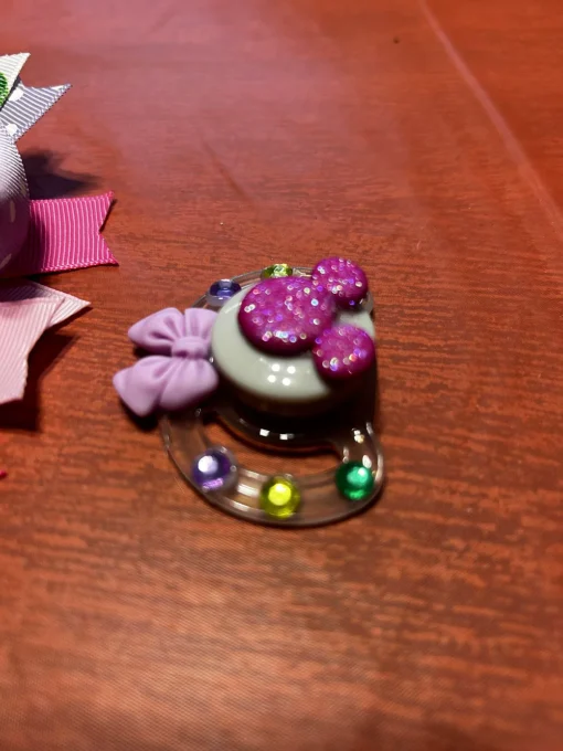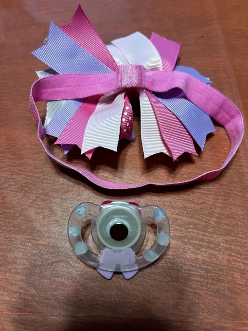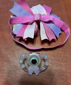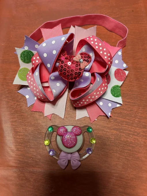 Minnie Mouse themed magnetic pacifier and head wrap.