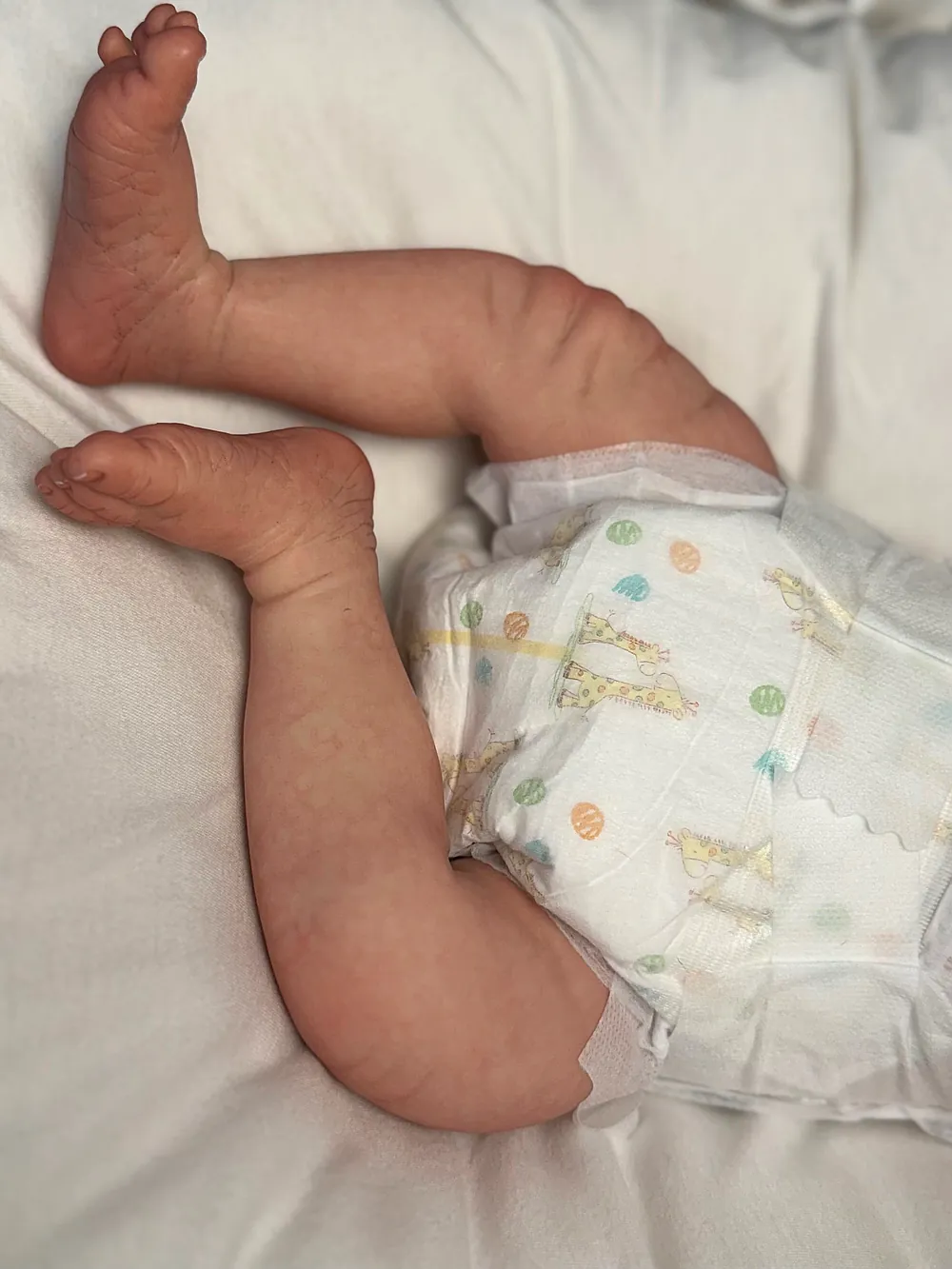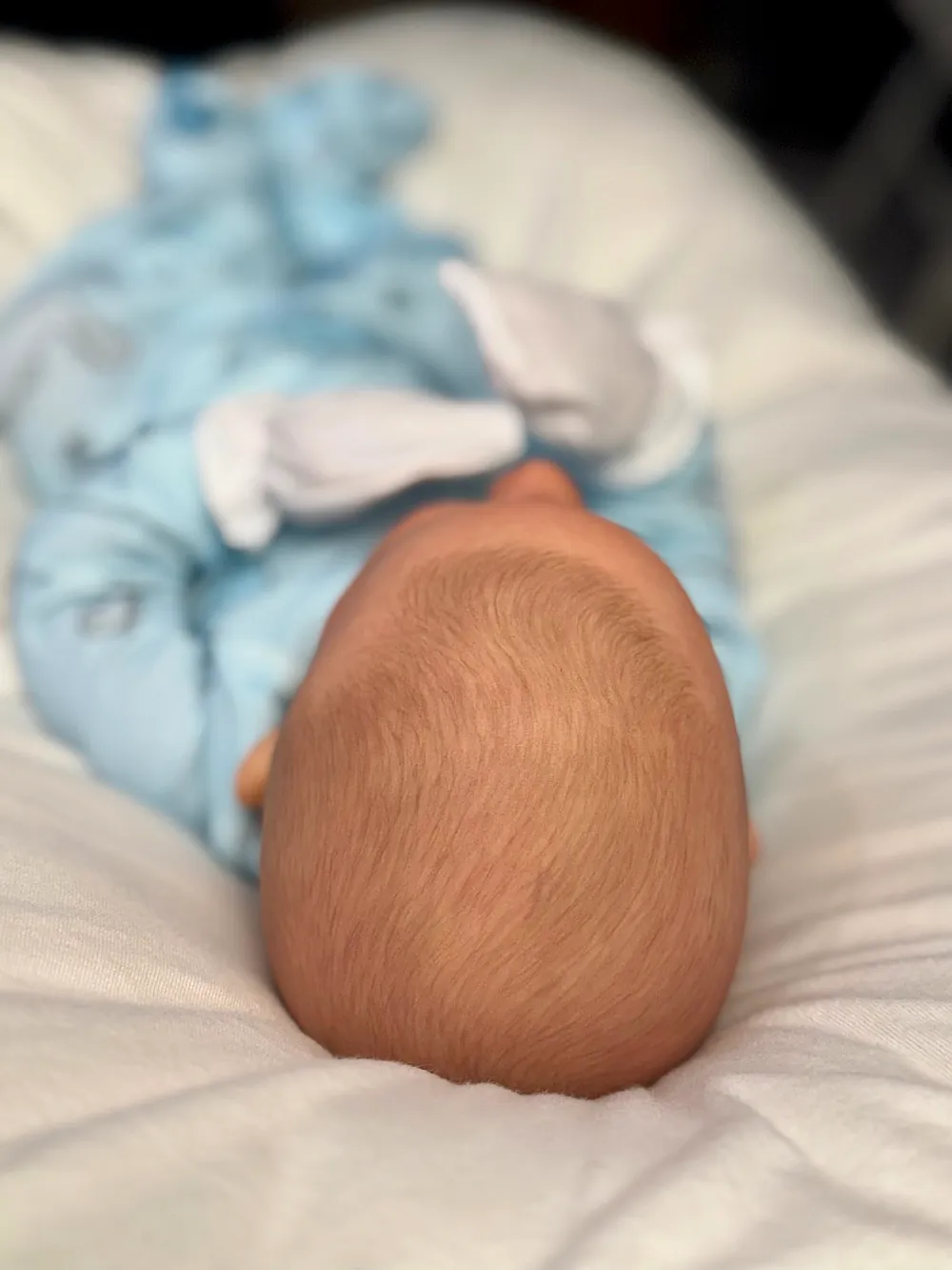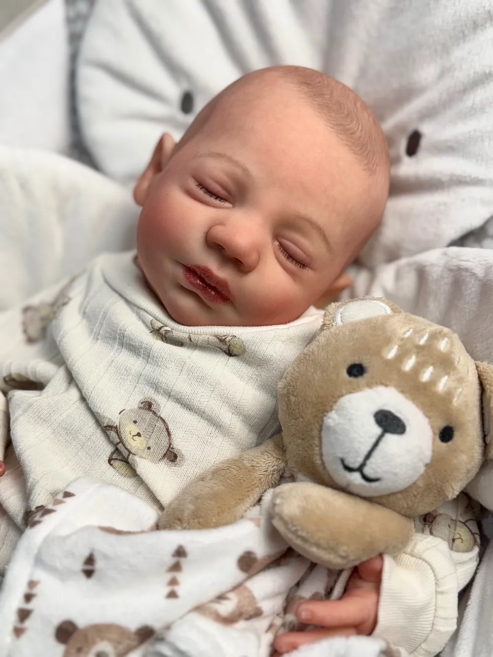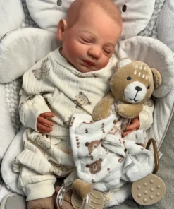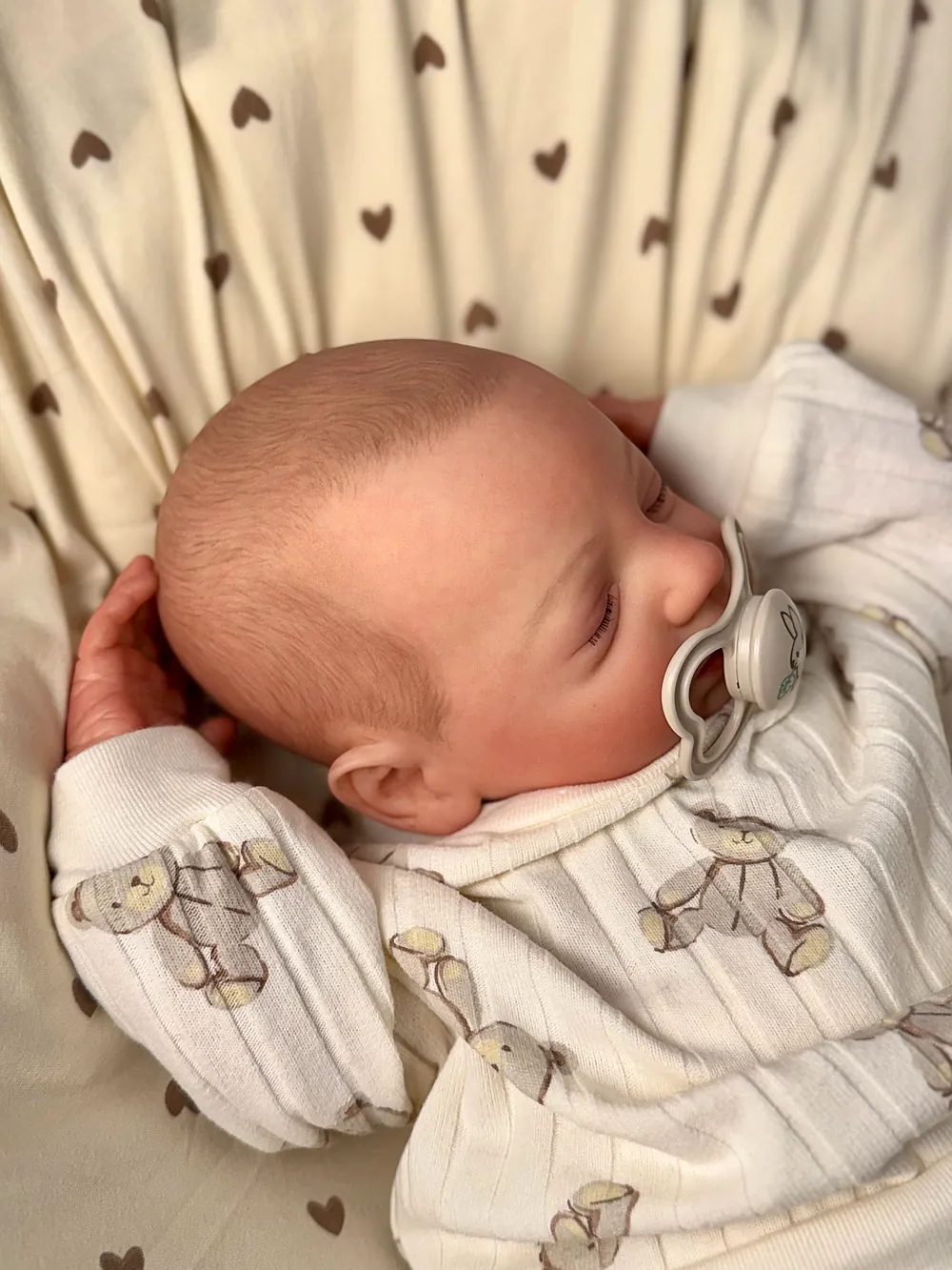I painted Steven with GHSP and finished with a matte varnish. He has subtle veining, capillaries, and newborn blemishing and painted brown hair. Steven is weighted to feel like a newborn, so you will want to support his head and pat his butt 🙂