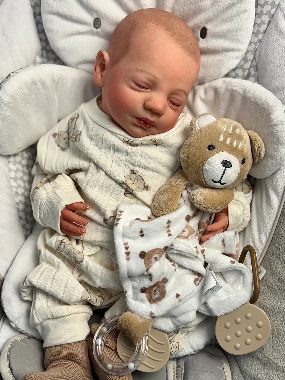Steven will come home with his teddy bear outfit and socks, his onesie and mittens, and his dinosaur sleeper. He will also come home with two Regular pacifiers, his COA, lovey, and his blanket. I’m also happy to include a small box opening with a few little extras for your new baby.