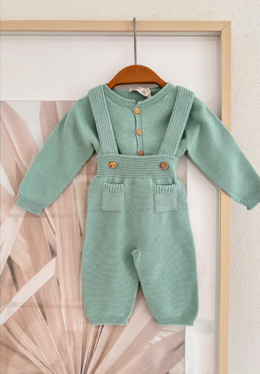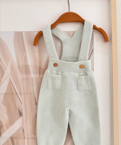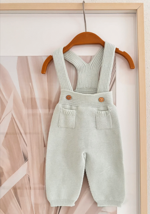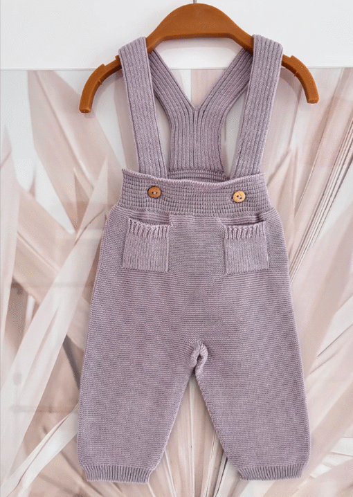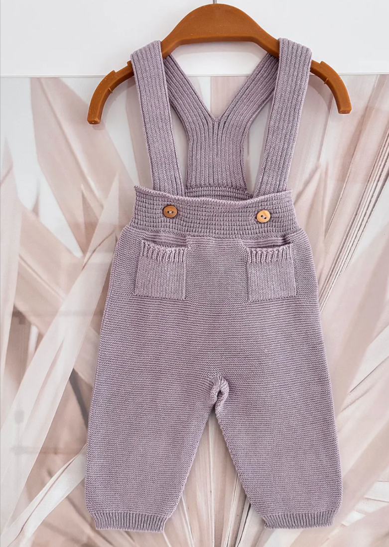 Cute long fine knit pants with straps and small pockets. They fasten at the straps with wooden buttons.